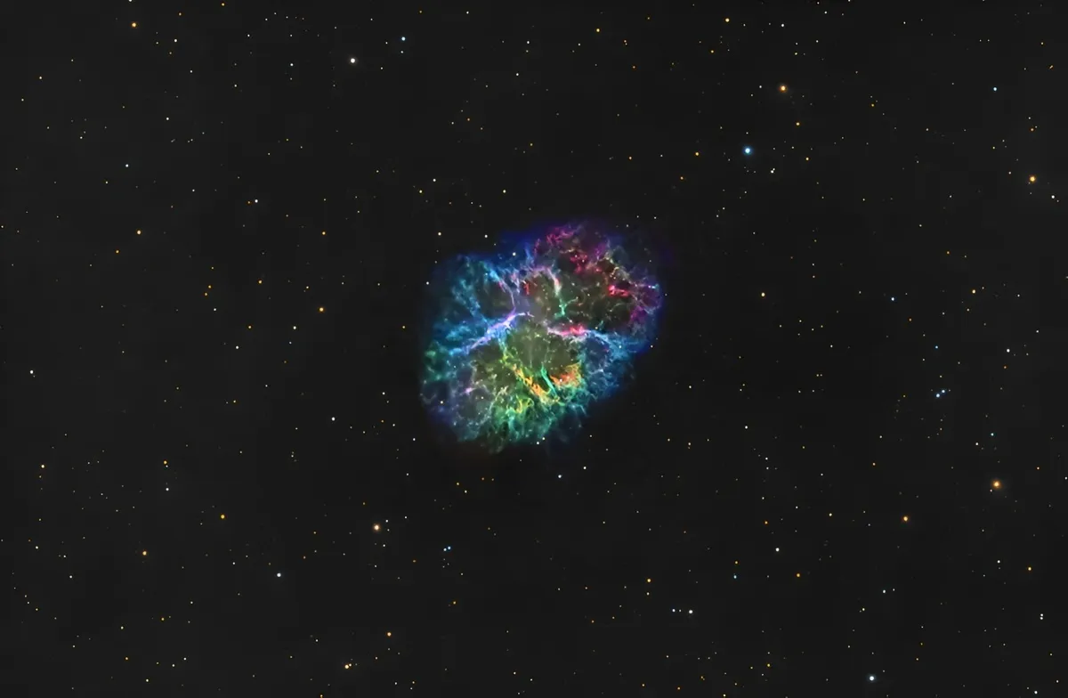 این تصویر توسط فردی به نام آسیمو دیفوسکو (assimo.difusco) ثبت شده است. محل عکسبرداری در کشور اسپانیا و تاریخ ثبت آن نیمهشب یکم نوامبر 2024 است. تجهیزات داده های به دست آمده در Skygems Officina Stellare Pro RC360، پایه Astro Physics GTO 1200، FLI Proline 16803 CCD، فیلترهای Astrodon H-alpha/OIII/SII است.