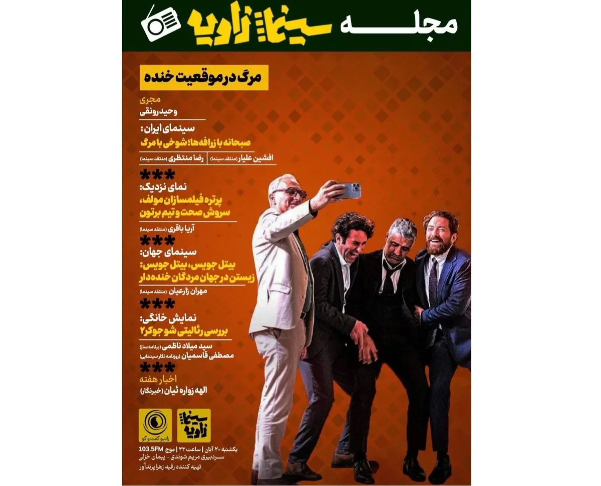 «سینما زاویه» به سردبیری مریم شوندی و پیمان خزلی و تهیهکنندگی رقیه پرندآور، یکشنبه شبها از ساعت ۲۲ روی موج رادیو گفتگو میرود.