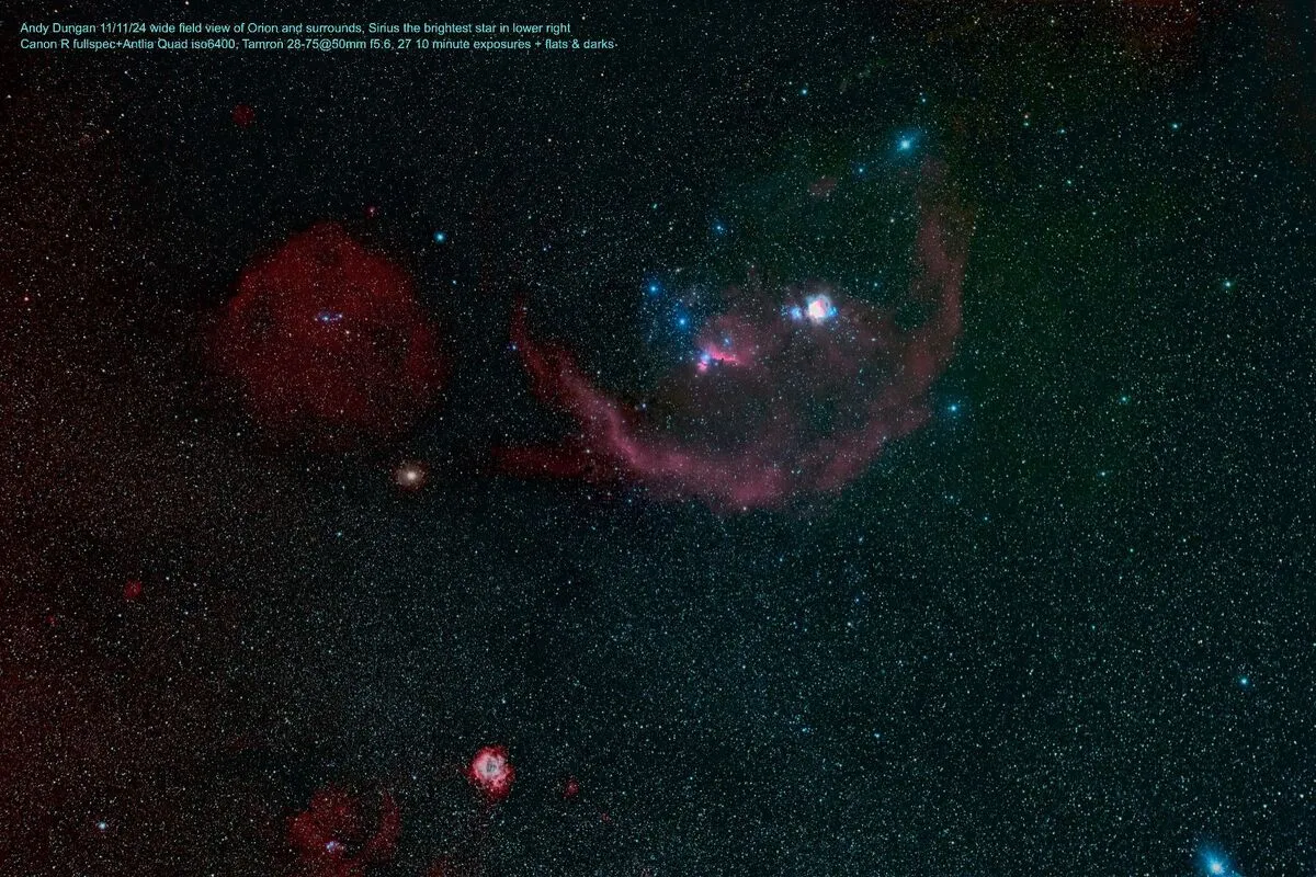 شگفت انگیز است که چقدر با جزئیات خوب و به زیبایی می‌توان آسمان شب را به تصویر کشید، به خصوص اگر سوژه تان چیزی نمادین همچون صورت فلکی شکارچی (Orion) باشد. تصویربرداری با دوربین Canon R و فیلتر Antlia Quad گرفته شده است! شنیدن اینکه از ابزارهایی مانند Affinity Photo و Starnet2 برای پردازش تصاویر خود استفاده می‌کنید بسیار عالی است. این تکنیک‌ها واقعاً عمق عکس‌های شما را افزایش می‌دهند.