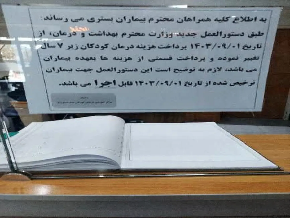 در این اطلاعیه نوشته شده است: «به اطلاع کلیه همراهان محترم بیماران بستری می‌رساند، طبق دستورالعمل جدید وزارت بهداشت و درمان از تاریخ یکم آذرماه ۱۴۰۹، پرداخت هزینه درمان کودکان زیر ۷ سال دچار تغییرات شده و پرداخت قسمتی از هزینه‌ها بر عهده بیماران می‌باشد. لازم به ذکر است که این دستورالعمل جهت بیماران ترخیص شده از تاریخ یک آذرماه ۱۴۰۳ قابل اجرا است.»