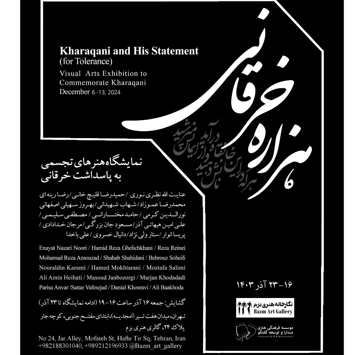 بازخوانی این سخن نه به عنوان گزارشی کهن که به کار دیرینه‌شناسان بیاید بلکه به عنوان شیوه‌ای از زیستن در دنیای پر آشوب امروز مورد نظر است. نمایشگاه اکنون به پاسداشت هزاره خرقانی و بیانیه رواداری‌اش از آثار سه نسل هنرمندان ایرانی گرد آمده است که این میراث حکیمانه را با تنوعی در خور توجه، دستمایه آفرینش هنری خود قرار داده‌اند.