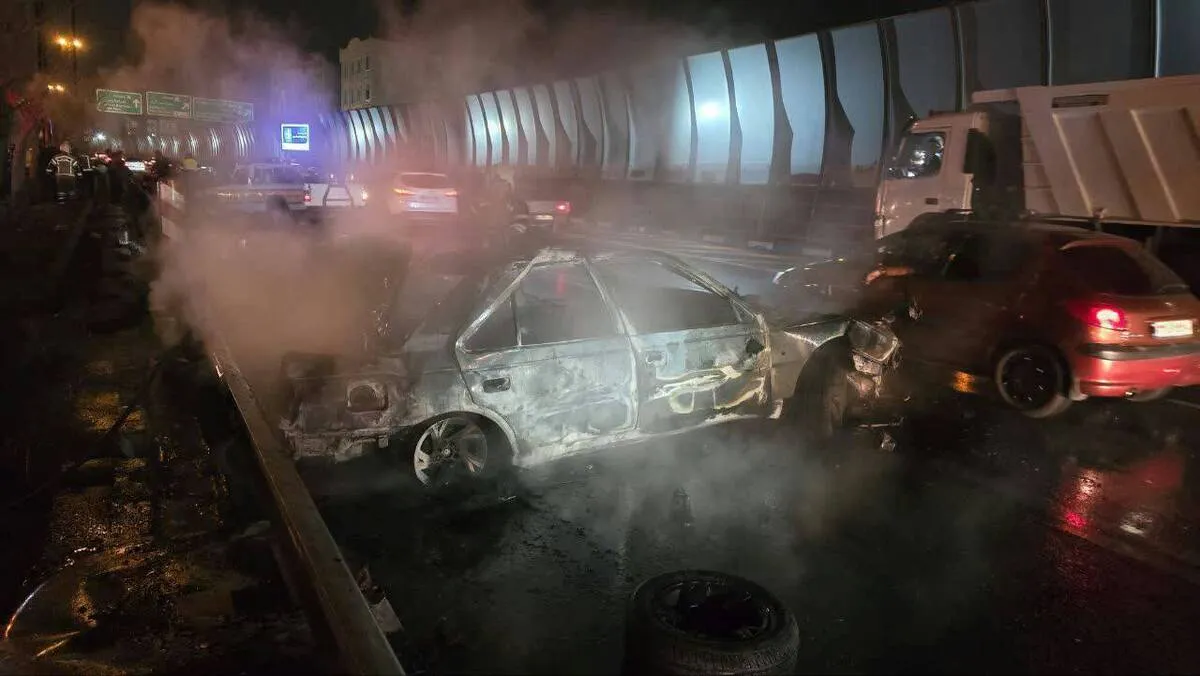 تصادف در بزرگراه حکیم منجر به آتش گرفتن خودرو شد