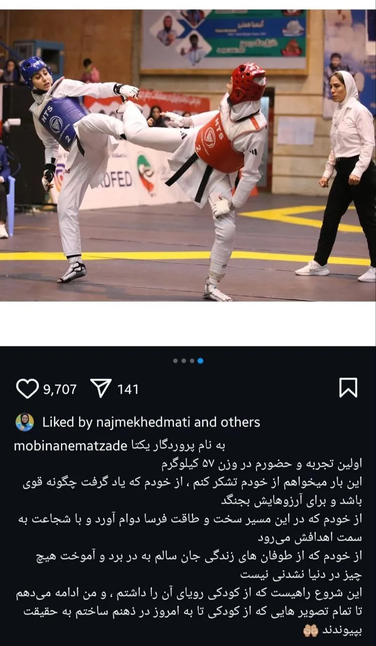 به گزارش خبرگزاری آنا، مبینا نعمت زاده ملی پوش تکواندوی کشورمان با انتشار متنی در صفحه اینستاگرامش نسبت به تغییر وزنش واکنش نشان داد. وزنی که ناهید کیانی نایب قهرمان المپیک کشورمان در آن حضور دارد. چند روز پیش هم در لیگ تکواندوی بانوان کشورمان نعمت زاده موفق شد کیانی را در وزن ۵۷ کیلوگرم شکست بدهد و قهرمان این وزن شود.