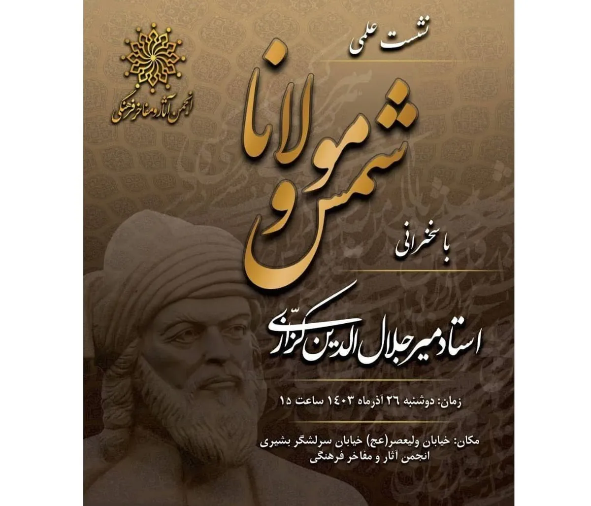 به گزارش خبرگزاری آنا، نشست علمی «شمس و مولانا» با سخنرانی میرجلالالدین کزازی، چهره ماندگار زبان وادب فارسی به همت انجمن آثار و مفاخر فرهنگی، دوشنبه ۲۶ آذرماه در تالار اجتماعات شهید مطهری (ره) انجمن برگزار میشود.