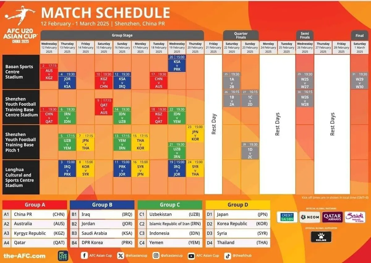 به گزارش خبرگزاری آنا، برنامه کامل بازیهای جام ملتهای زیر ۲۰ سال آسیا که از چهارشنبه ۲۴ بهمن ماه سال جاری در شهر شن ژن چین آغاز میشود منتشر شد.