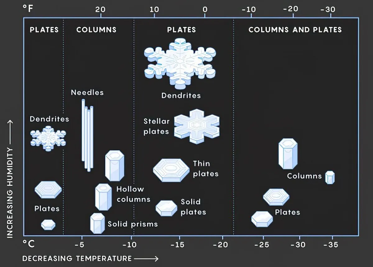 دانههای برف میتوانند در اشکال متنوعی ظاهر شوند. برخی از آنها شبیه گلهای ششپر (Hexagonal Flowers) هستند، در حالی که برخی دیگر ممکن است به شکل ستارههایی در هم پیچیده یا حتی دانههای گرد باشند. این تنوع ناشی از تغییرات در شرایط جوی است که بر روی نحوه رشد بلورهای یخ تأثیر میگذارد.
