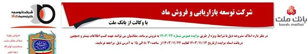 براساس این گزارش، املاک مازاد بانک ملت از طریق شرکت توسعه بازاریابی و فروش ماد با وکالت این بانک، از طریق مزایده عمومی و با شرایط ویژه به فروش خواهد رسید.