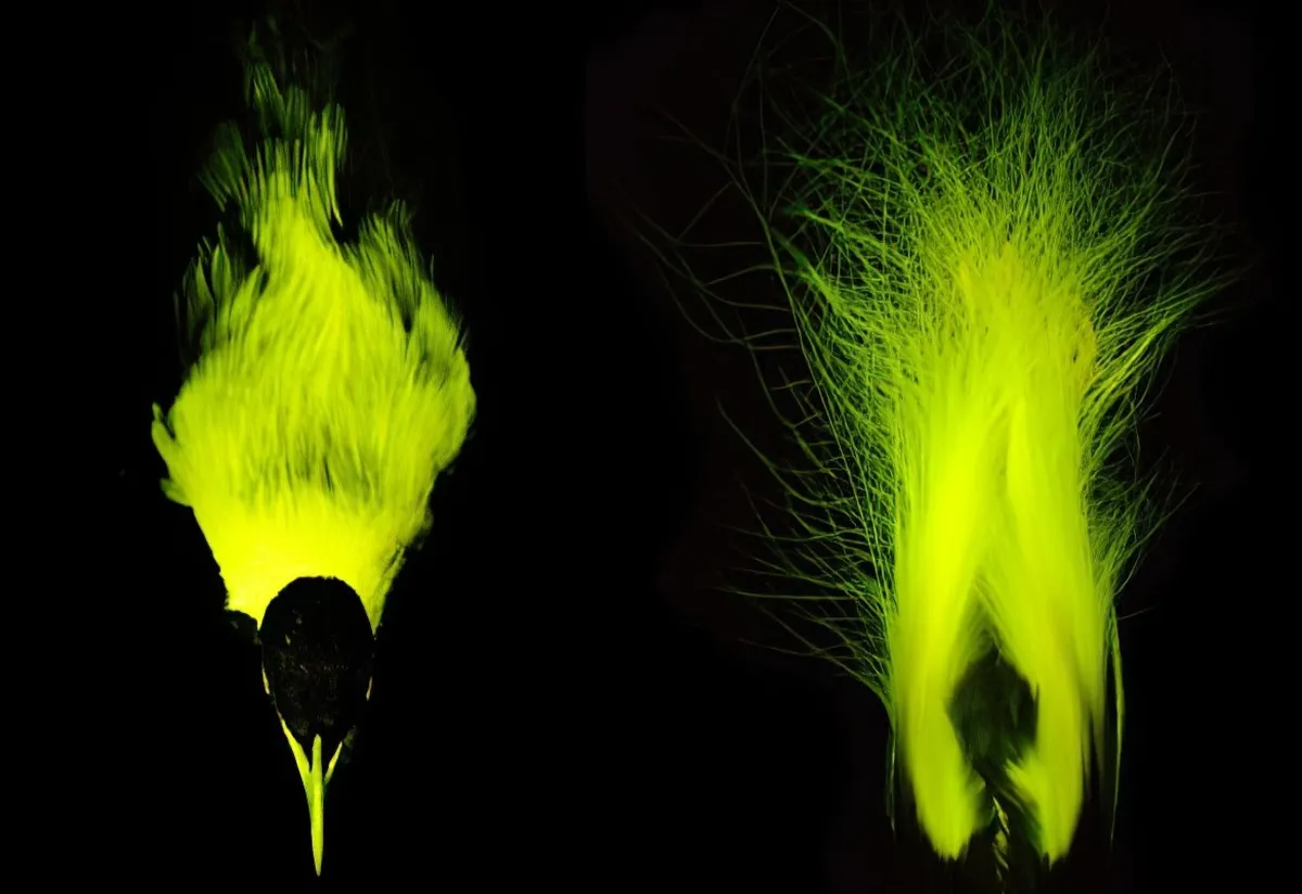 در بیشتر پرندگان نر که مورد آزمایش قرار گرفتند، سر، گردن، منقار و پرهایشان به رنگ سبز میدرخشید. قابل ذکر است که این بخشهای تابناک، اغلب با پرهای تیرهای که خاصیت فلورسانس ندارند احاطه شده است. جالب است که بدانید این نواحی از بدن، معمولاً در نمایشهای جفتگیری استفاده میشود (زمانی که پرندگان نر با بال زدن، چرخیدن، تاب خوردن و ژست گرفتن، سعی در جلب توجه جنس ماده دارند). همچنین مشخص شد که برخی گونههای ماده نیز دارای خاصیت فلورسانس هستند، اگرچه درخشندگی آنها کمتر از نرها است.