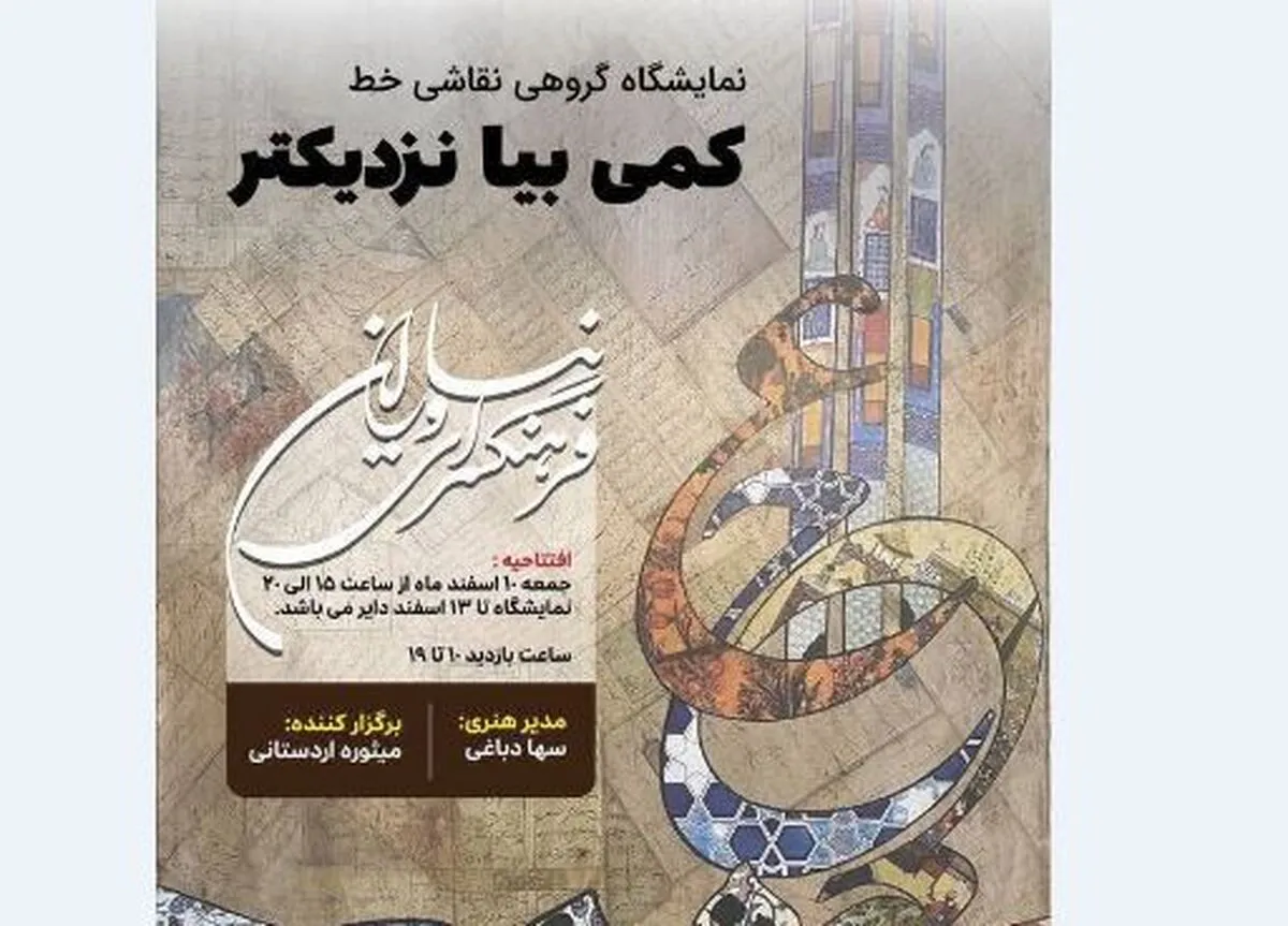 آثار نقاشیخط چهل هنرمند در نمایشگاهی با عنوان «کمی بیا نزدیکتر» به همت گالری سها، در نگارخانه شماره دو فرهنگسرای نیاوران به نمایش در میآیند.