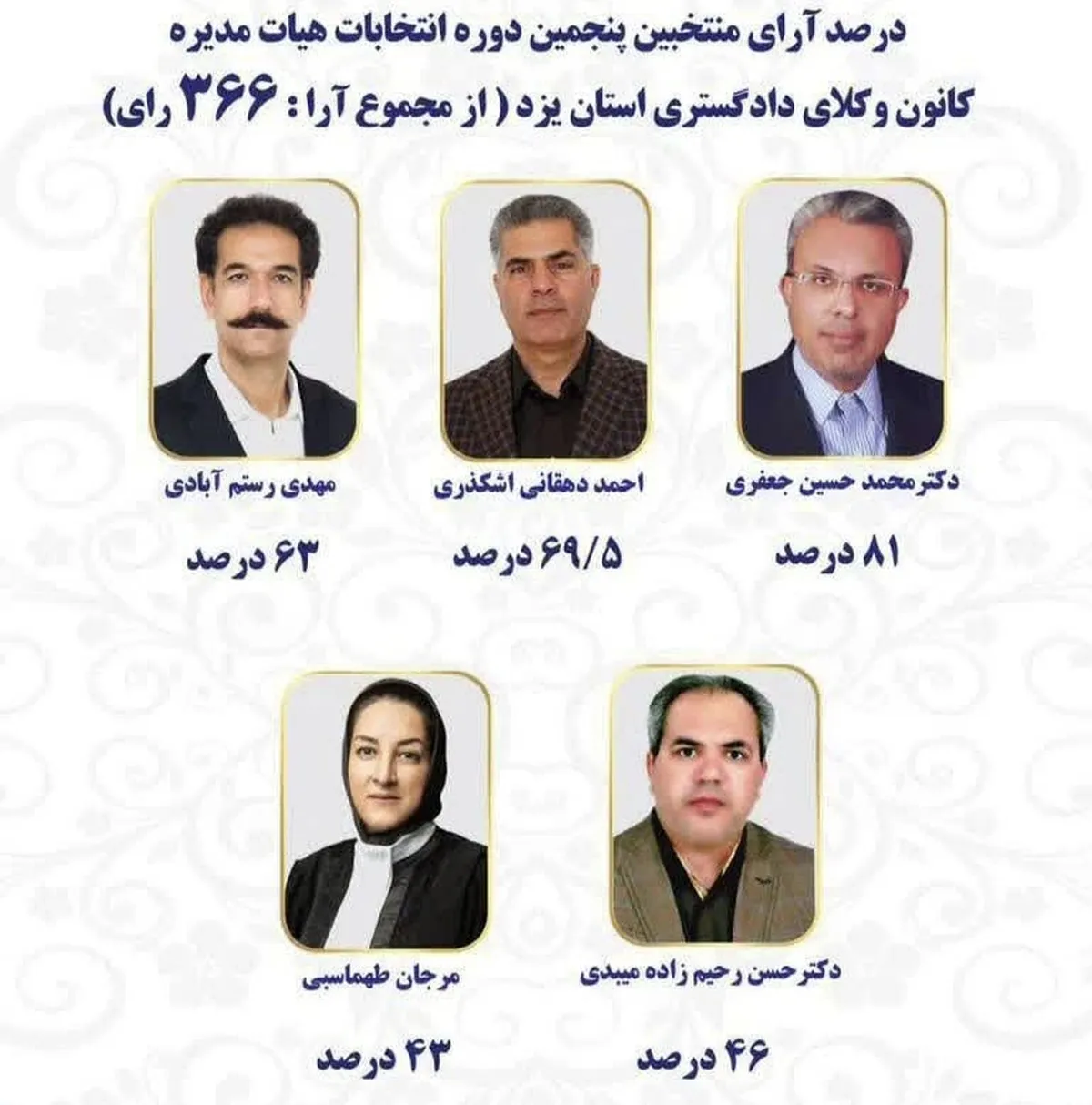 انتخابات پنجمین دوره هیئت‌مدیره کانون وکلای دادگستری استان یزد برگزار و اعضای هیئت علمی دانشگاه آزاد اسلامی یزد موفق به کسب آرای بالا شدند.