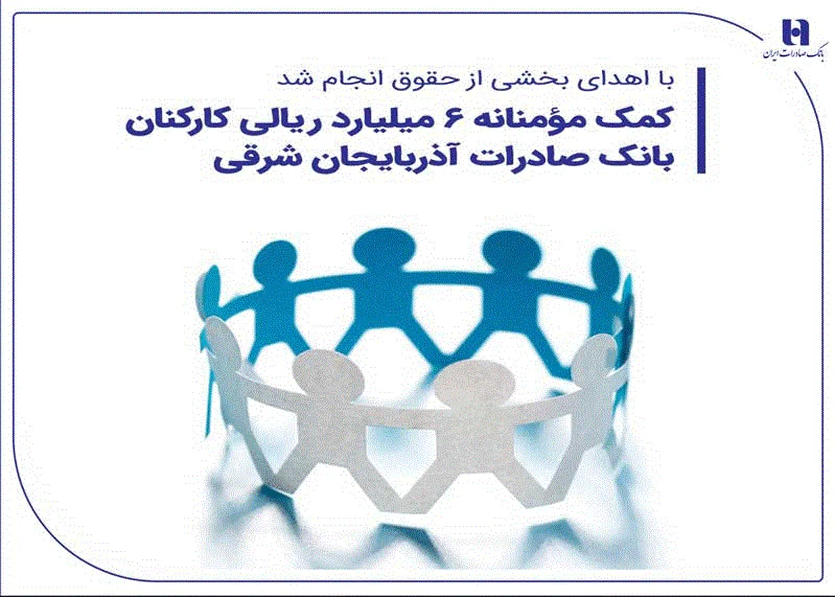 در تازه‌ترین اقدام، کارکنان بانک صادرات ایران در استان آذربایجان‌شرقی مبلغ 6 میلیارد ریال از محل اهدای حقوق و مرخصی خود، برای کمک‌های مومنانه و حمایت از خانواده‌های نیازمند و آسیب‌ دیده استان جمع‌آوری کردند. این حرکت انسان‌دوستانه با هدف کاستن از مشکلات معیشتی و ایجاد روحیه همبستگی و تعاون در جامعه انجام شده است.