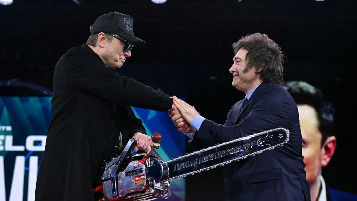 چندی پیش، «خاویر میلی» رئیسجمهور آرژانتین یک اره برقی به ماسک هدیه داد. رئیس اداره کارآمدی دولت ترامپ هم هدیه را بالای سرش چرخاند و گفت این اره برقی برای (قطع) بروکراسی است.