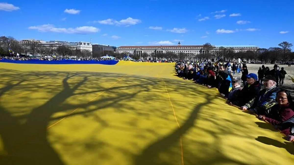 هزاران تظاهرکننده در نزدیکی کاخ سفید در حمایت از اوکراین بزرگترین پرچم این کشور را به نمایش گذاشتند و از واشنگتن خواستند تا به حمایت خود از کییف در برابر روسیه ادامه دهد.