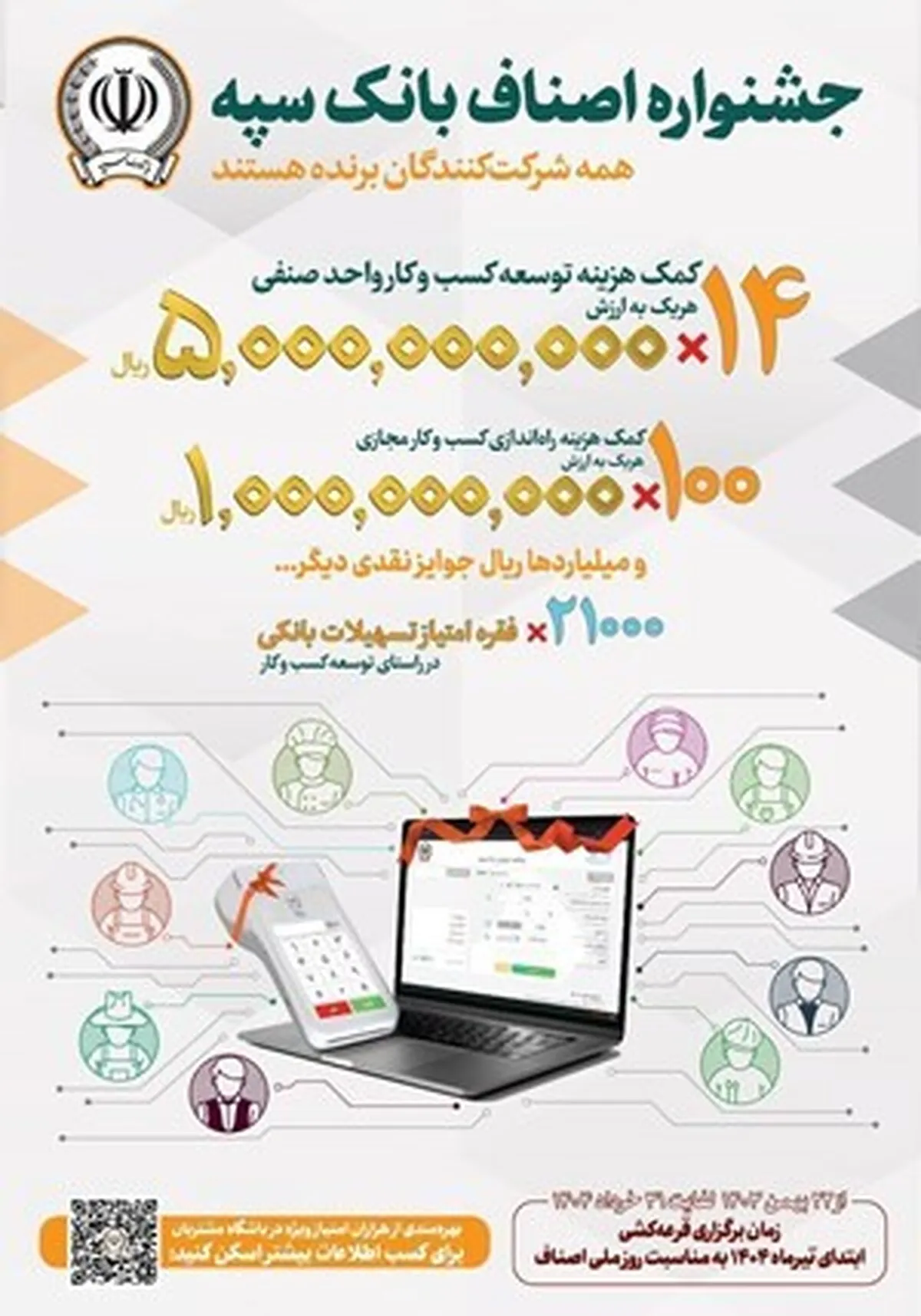 واجدین شرایط از جوایز تخصیص یافته در قرعهکشی 14 جایزه ویژه کمک هزینه توسعه کسب و کار واحد صنفی هر یک به ارزش پنج میلیارد ریال، 100 کمک هزینه راهاندازی کسب و کار مجازی هریک به ارزش یک میلیارد ریال، میلیاردها ریال جوایز نقدی و امتیاز استفاده از 21000 فقره تسهیلات بانک سپه، بهرهمند می شوند.