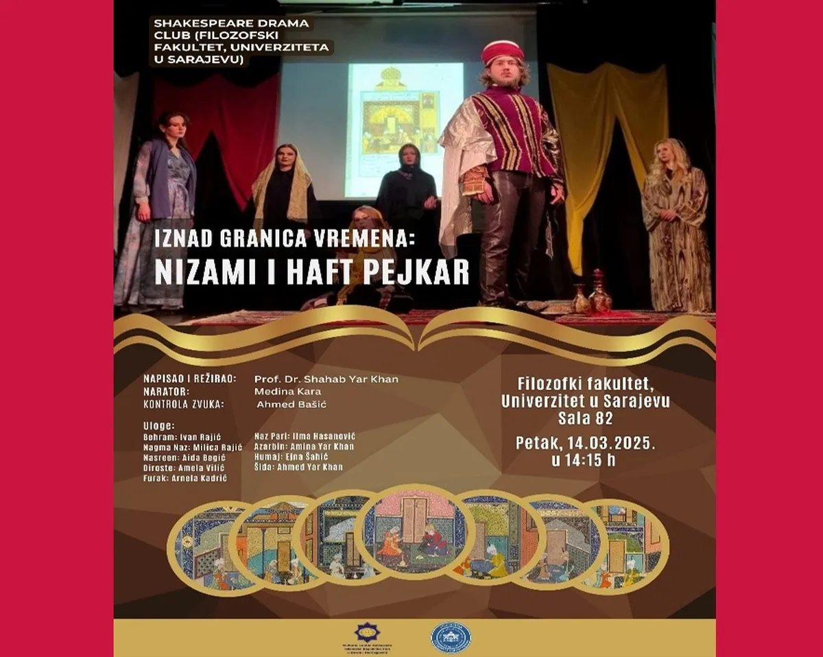 به گزارش خبرگزاری آنا، به همت دانشجویان گروه زبان و ادبیات انگلیسی دانشگاه سارایوو (گروه نمایشی شکسپیر) و با همکاری رایزنی فرهنگی ایران در بوسنی و هرزگوین و دانشکده فلسفه دانشگاه سارایوو، تئاتر «هفت پیکر حکیم نظامی و روایت بانوی گنبد سرخ» در محل دانشکده فلسفه دانشگاه سارایوو به روی صحنه میرود.