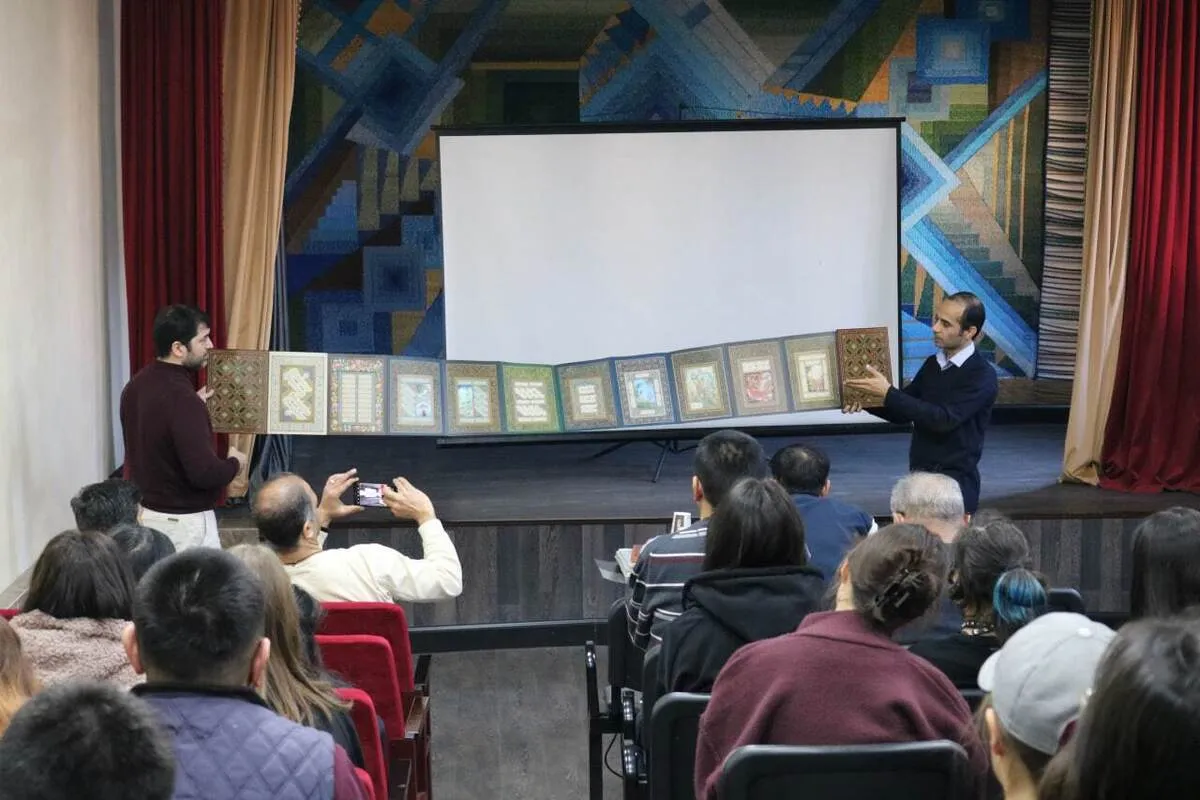 در این نشست که با حضور ابوذر طوقانی رایزن فرهنگی ایران در قرقیزستان، خانم قادرقل معاون پرورشی و اساتید هنرستان و جمع زیادی از هنرآموزان این هنرستان انجام شد، حسین رضوی فرد، مهرداد بابایی، مهدی مهدوی و علی میرزاخانیان اساتید رشتههای خوشنویسی، مرمریس، نگارگری و میناکاری در سخنانی به معرفی خود و رشته هنری خود پرداختند.