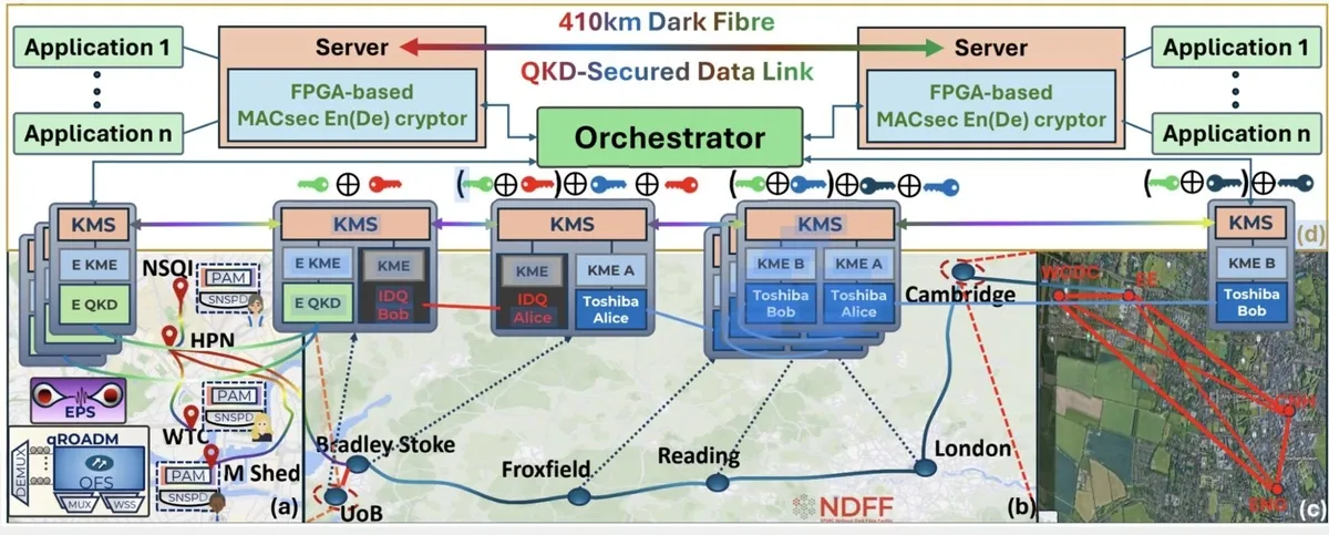 این نخستین بار است که شبکهای بلندبرد QKD و توزیع درهمتنیدگی را به همراه انتقال دادهی کلاسیک ترکیب کرده است. این زیرساخت بر پایه «شبکه کوانتومی بریتانیا» (UKQN) ساخته شده که در دههی گذشته با حمایت EPSRC و هاب ارتباطات کوانتومی توسعه یافته و شبکههای کوانتومی شهری بریستول و کمبریج را از طریق چهار لینک فیبر نوری بلند و سه گرهی میانی به هم متصل میکند.