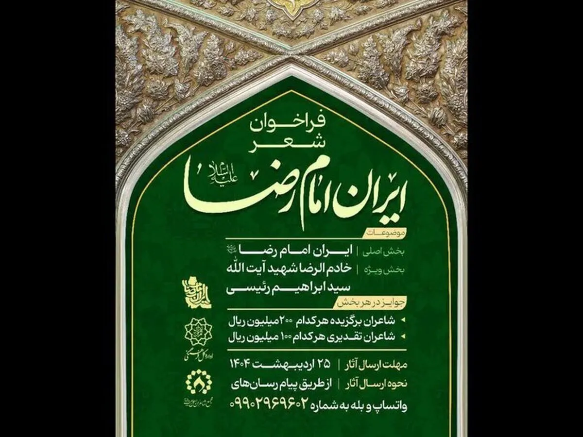کنگره ملی شعر «ایرانِ امام رضا (ع)» با بخش اصلی با موضوع امام رضا (ع) و بخش ویژه با موضوع شهید سید ابراهیم رئیسی فراخوان داد.