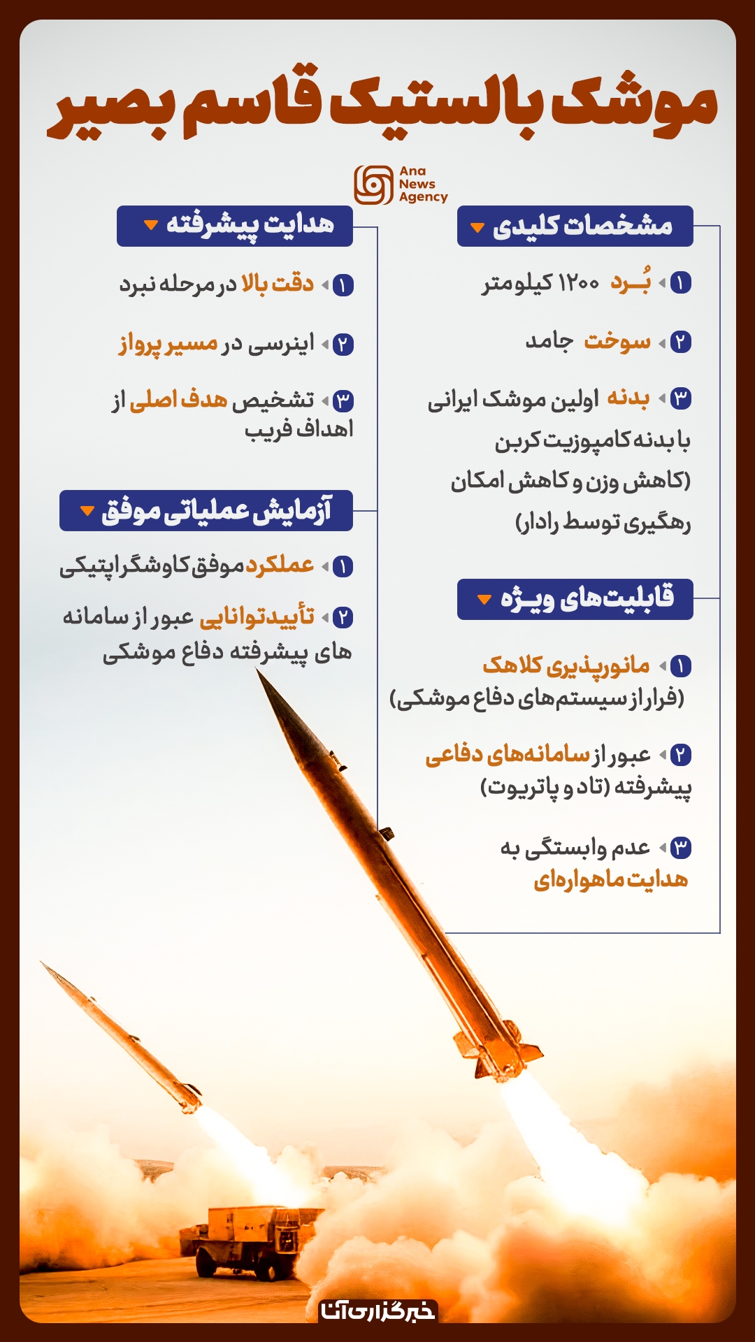 موشک بالستیک قاسم بصیر با برد ۱۲۰۰ کیلومتری و سوخت جامد، این موشک بالستیک اولین نمونه ایرانی با بدنه کامپوزیت کربن است که امکان رهگیری توسط رادار را به حداقل میرساند.