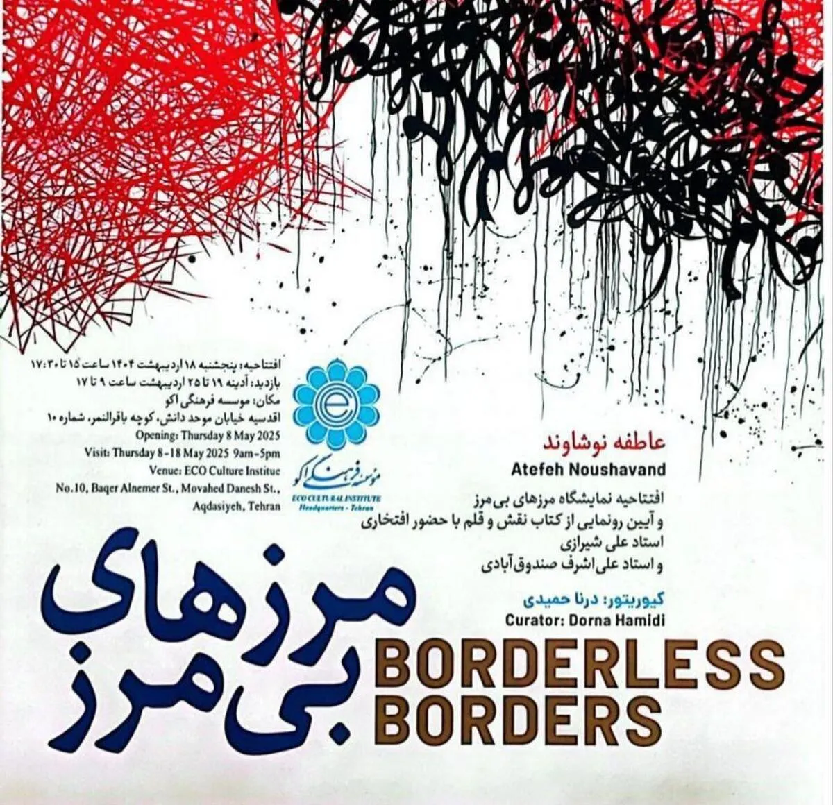 نمایشگاه «مرز‌های بی‌مرز» روز پنجشنبه ۱۸ اردیبهشت ساعت ۱۵ افتتاح می‌شود و از ۱۹ تا ۲۷ اردیبهشت در موسسه فرهنگی اکو از ساعت ۹ تا ۱۷ برای بازدید علاقه‌مندان برپا است