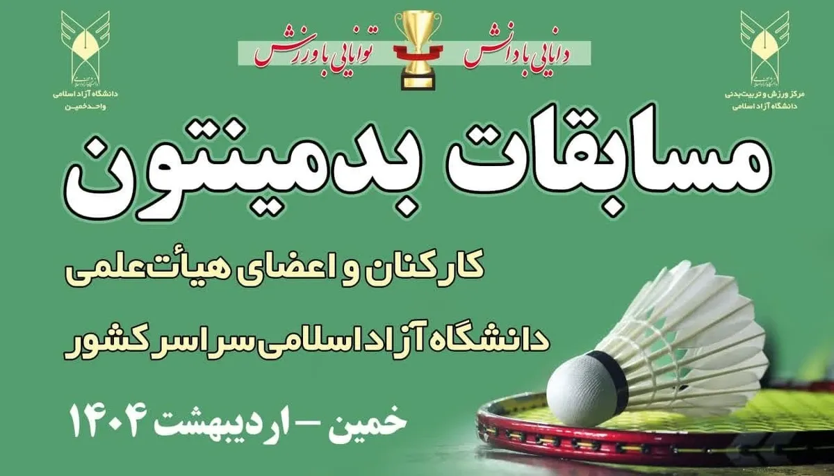 دانشگاه آزاد اسلامی زادگاه بنیانگذار کبیر انقلاب اسلامی تا 31 اردیبهشت میزبان مسابقات بدمینتون خواهد بود و در این دوره از مسابقات، ورزشکارن کارمند و عضو هیئتعلمی از واحدهای دانشگاهی آزاد اسلامی سراسر کشور در دو بخش آقایان و بانوان به میزبانی واحد خمین از ۲۲ تا ۳۱ اردیبهشت ۱۴۰۴ در مجموعه ورزشی شهدای دانشجو به مصاف هم خواهند رفت.