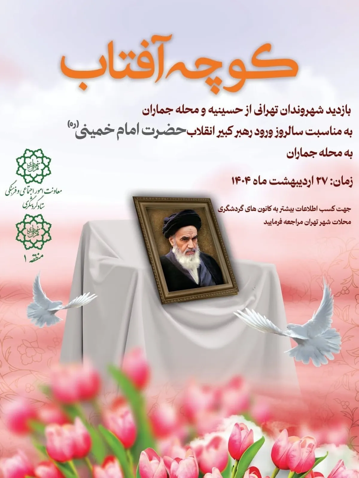به گزارش خبرگزاری آنا، دومین ویژه برنامه « کوچه آفتاب» با همکاری شهرداری منطقه ۱ وموسسه تنظیم ونشر آثار امام خمینی (ره) روز شنبه ۲۷ اردیبهشت ماه از ساعت ۱۰ تا۱۲ با حضور علاقمندان از کلیه مناطق ۲۲ گانه اجرا خواهد شد.