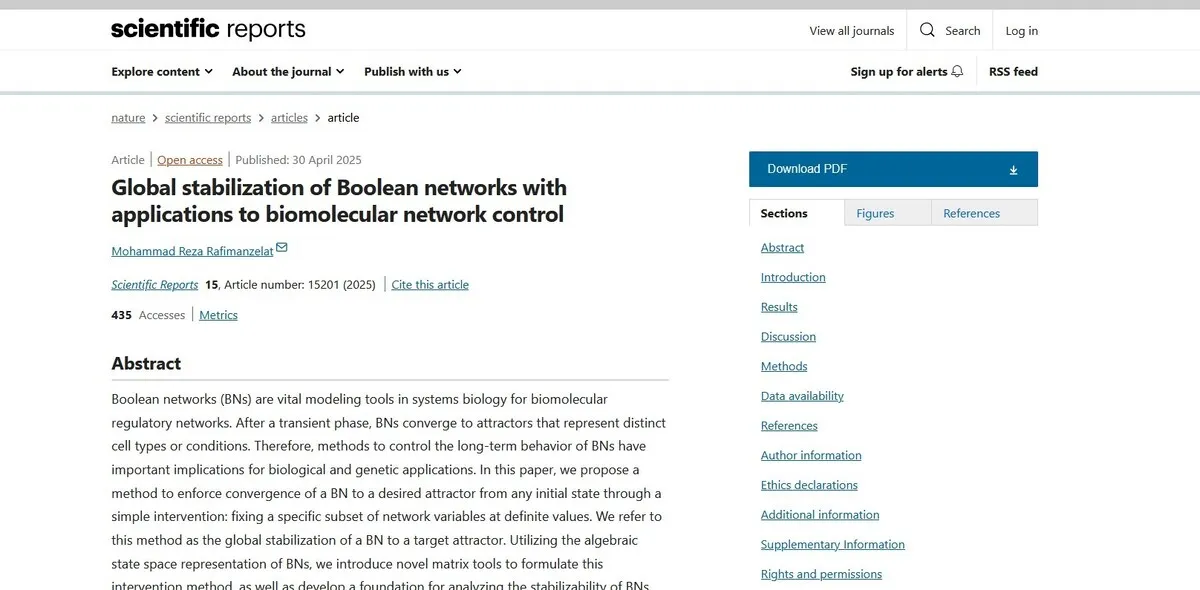 وی اضافه کرد: محمدرضا رفیعمنزلت عضو هیئت علمی گروه برق واحد دولتآباد موفق شد مقالهای با عنوان «Global Stabilization of Boolean Networks with Applications to Biomolecular Network Control» را در نشریه علمی معتبر Scientific Reports به چاپ برساند.