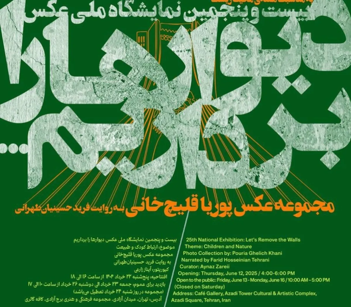 به گزارش خبرگزاری آنا، نمایشگاه انفرادی عکس «دیوارها را برداریم» با مجموعه ۳۶ اثر از پوریا قلیچ خانی و با روایتی از فرید حسینیان طهرانی، به مناسبت هفته محیطزیست، از ساعت ۱۶ الی ۱۸ روز پنجشنبه ۲۲ خرداد ۱۴۰۴ با حضور پدیدآورنده و راوی آثار و همچنین، آیناز زارعی، نقاش، مدیر گروه هنری آیتیست و کیوریتور رویداد در کافه گالری مجموعه فرهنگی و هنری برج آزادی افتتاح میشود.