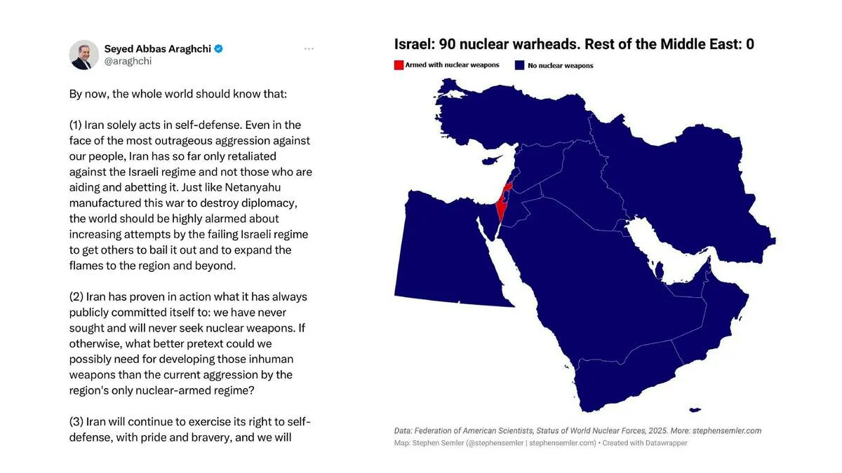 وی همچنین تأکید کرد که ایران همواره به تعهد خود درباره عدم توسعه سلاح هستهای پایبند بوده و نخواهد بود، و اگر قصد دیگری داشت، بهانهای بهتر از این تجاوز غیرانسانی رژیم مسلح به سلاح هستهای در منطقه برای توسعه آن وجود نداشت.