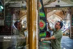 هماکنون، خادمان درحال سیاه پوشی حرم رضوی برای ورود به ماه محرم...