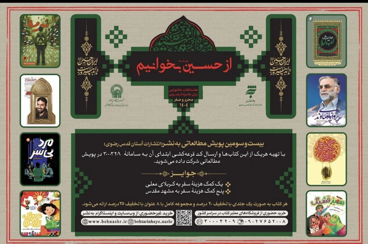 مسعود فرزانه با بیان اینکه در پویش «از حسین بخوانیم» آثار مطالعاتی برای مشارکت اقشار مختلف جامعه از کودک، نوجوان و بزرگسال در نظر گرفته شده است، اظهار کرد: در این پویش مطالعاتی 8 کتاب ویژه خانوادهها معرفی شده است که « سبز قشنگ» و «عصر یک روز گرم» ویژه کودکان و کتابهای « مرد بی سر»و «گل سرخ آزادی» برای نوجوانان و کتابهای « حدیث کعبه و کربلا» و«سرمه» برای بزرگسالان و با هدف معرفی قهرمانان ایثار و شهادت دو کتاب از مجموعه ادبیات پایداری که درباره شهید فخری زاده و شهید طهرانی مقدم است به نام های « پرواز پای دماوند» و «خط مقدم» نیز در نظر گرفته شده است.