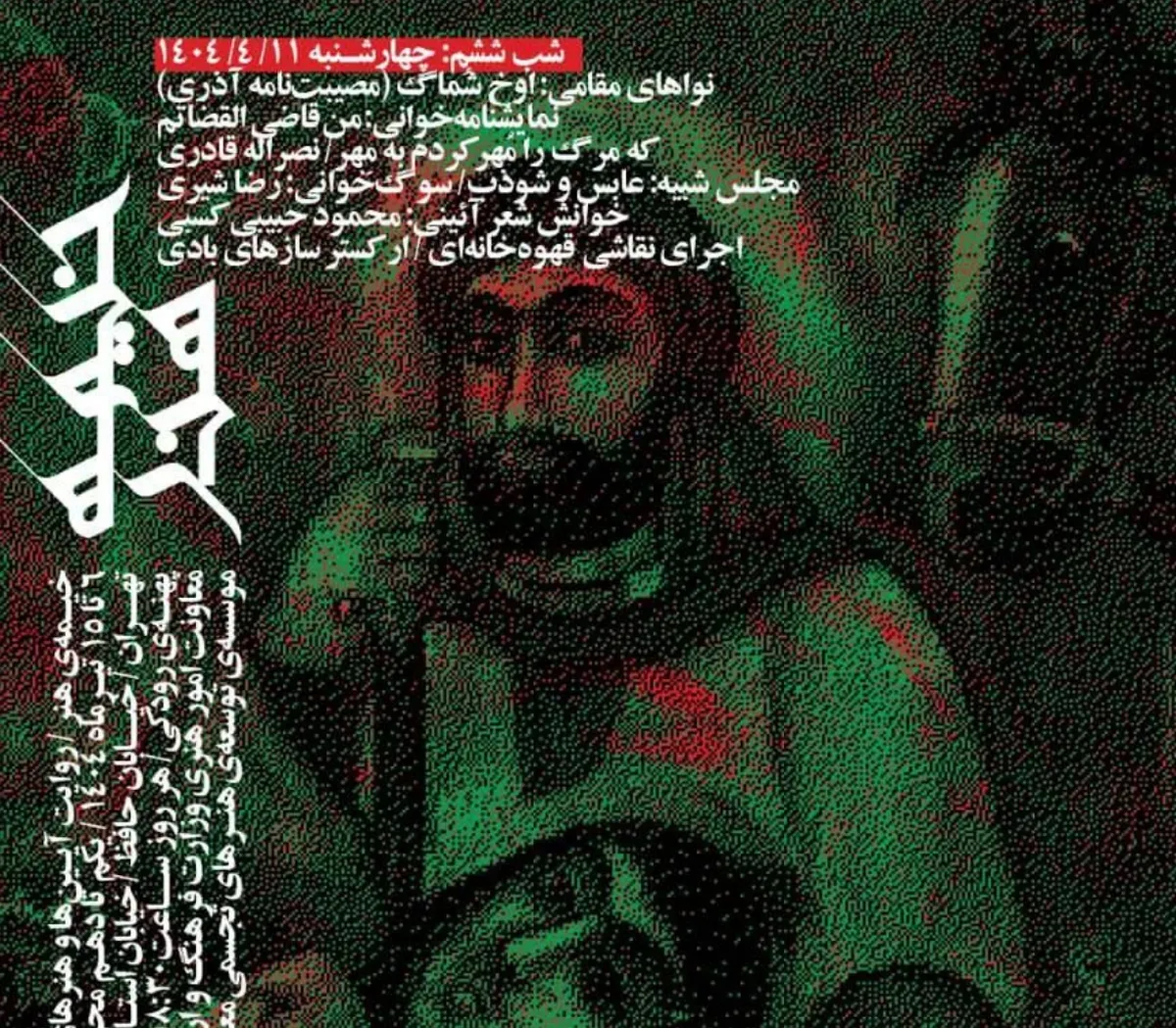 در ششمین روز ویژه‌برنامهٔ «خیمهٔ هنر» قطعات مختلفی از نوا‌های مرتبط با ایام سوگواری حضرت سیدالشهدا (ع) در پهنهٔ رودکی اجرا خواهد شد.