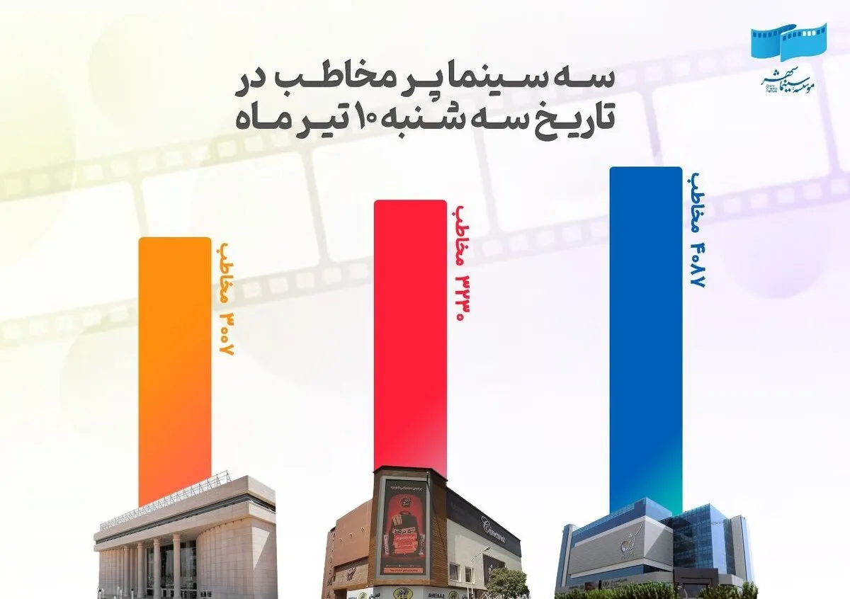 تعداد مخاطبان سینما در روز سه‌شنبه دهم تیرماه، به حدود یکصد هزار نفر رسید که در این میان پردیس «کورش» تهران، «هویزه» مشهد و «هنر شهر آفتاب» شیراز به ترتیب در فهرست پرمخاطب‌ترین مجموعه‌های سینمایی قرار گرفتند.