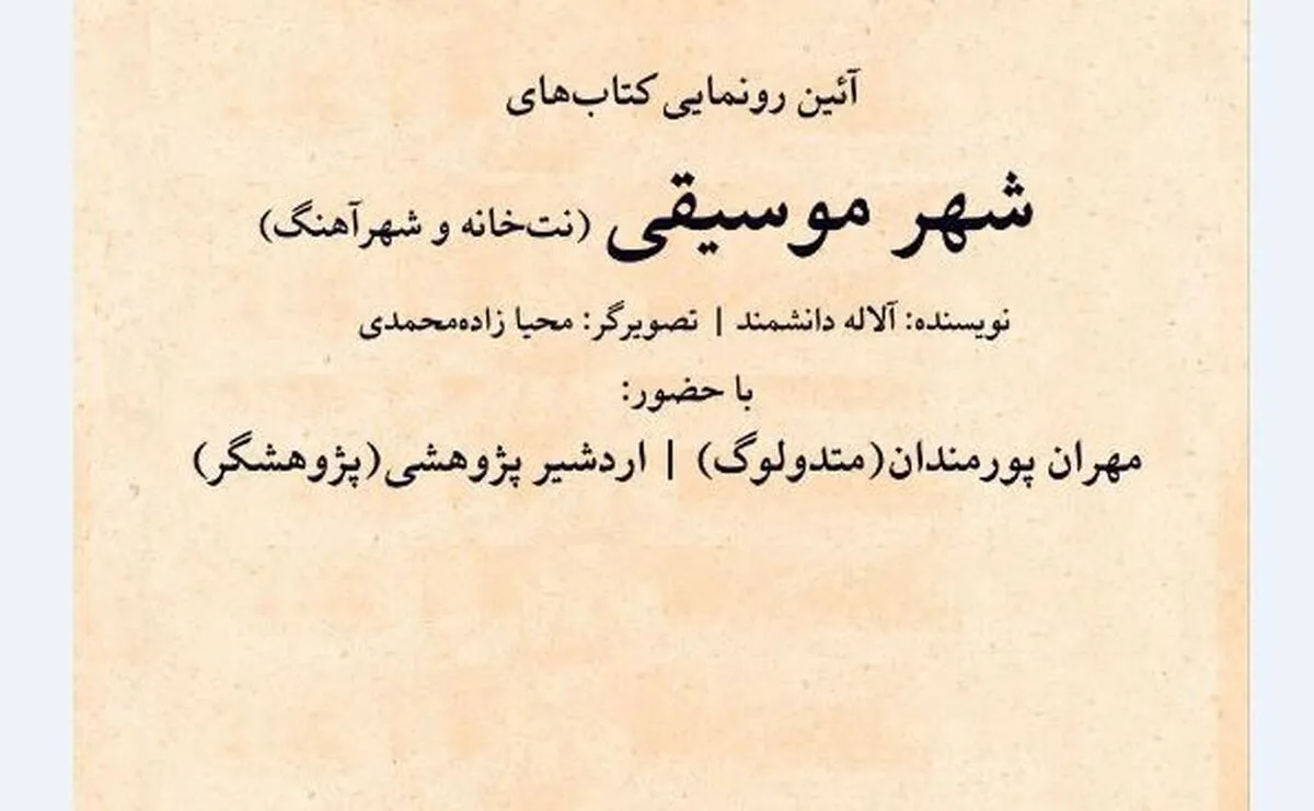 به گزارش خبرگزاری آنا، مراسم رونمایی از مجموعه دو جلدی «شهر موسیقی» شامل جلد نخست «نت‌خانه» و جلد دوم «شهر‌آهنگ»، نوشته آلاله دانشمند (کارشناس ارشد موسیقی و مربی موسیقی کودک)، روز جمعه ۱۰ مردادماه ساعت ۱۸ در فرهنگسرای ارسباران برگزار می‌شود.