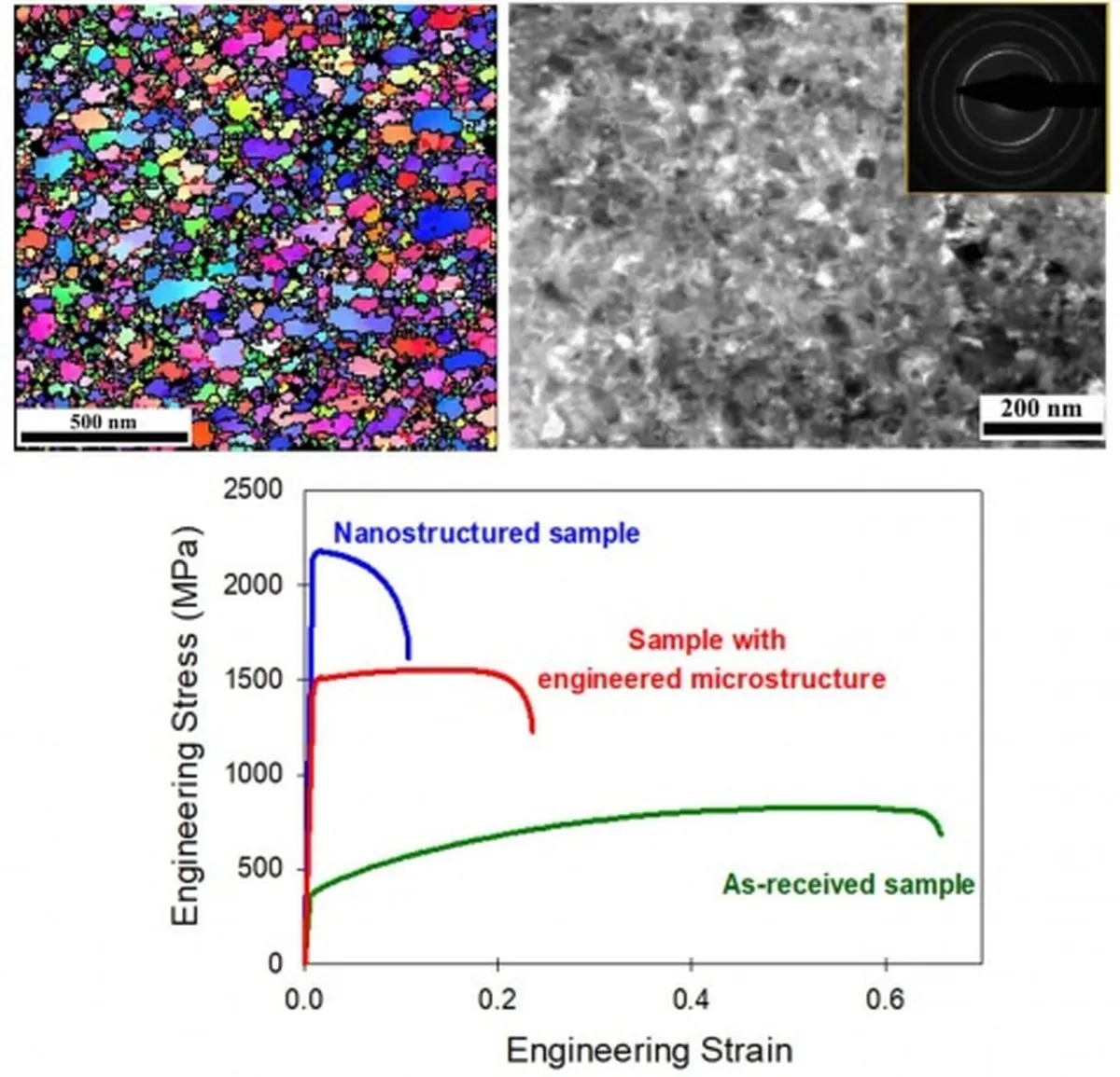 عضو هیأت‌علمی دانشکده متالورژی و مواد افزود: «این ریزساختار موجب افزایش چشمگیر استحکام کششی تا حدود ۲.۲ گیگاپاسکال شد. با این حال، کاهش شکل‌پذیری در این ماده نانوساختار قابل‌توجه بود. به منظور بازیابی شکل‌پذیری بدون افت زیاد در استحکام، از فرایند آنیل تدریجی (continuous annealing) تا دمای ۷۹۰ درجه سانتی‌گراد استفاده شد. این عملیات حرارتی باعث تبلور مجدد، رشد کنترل‌شده دانه‌ها تا ابعاد فوق‌ریز (~۲۲۰ نانومتر) و همچنین کنترل تشکیل فاز بین‌فلزی سیگما گردید.