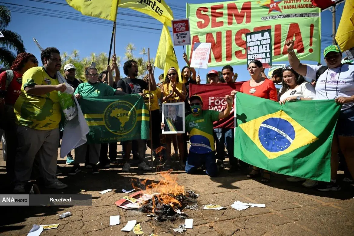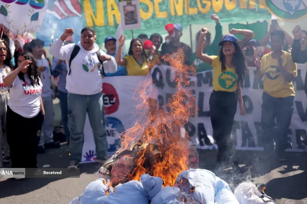 مردم برزیل در اعتراض به سیاست های ترامپ پرچم آمریکا و دلار این کشور را به آتش کشیدند.ترامپ در واکنش به پیگرد قانونی رئیس جمهور سابق، ژایر بولسونارو، متحد راست افراطی خود، برزیل را با تعرفه‌های ۵۰ درصدی هدف قرار داده است.