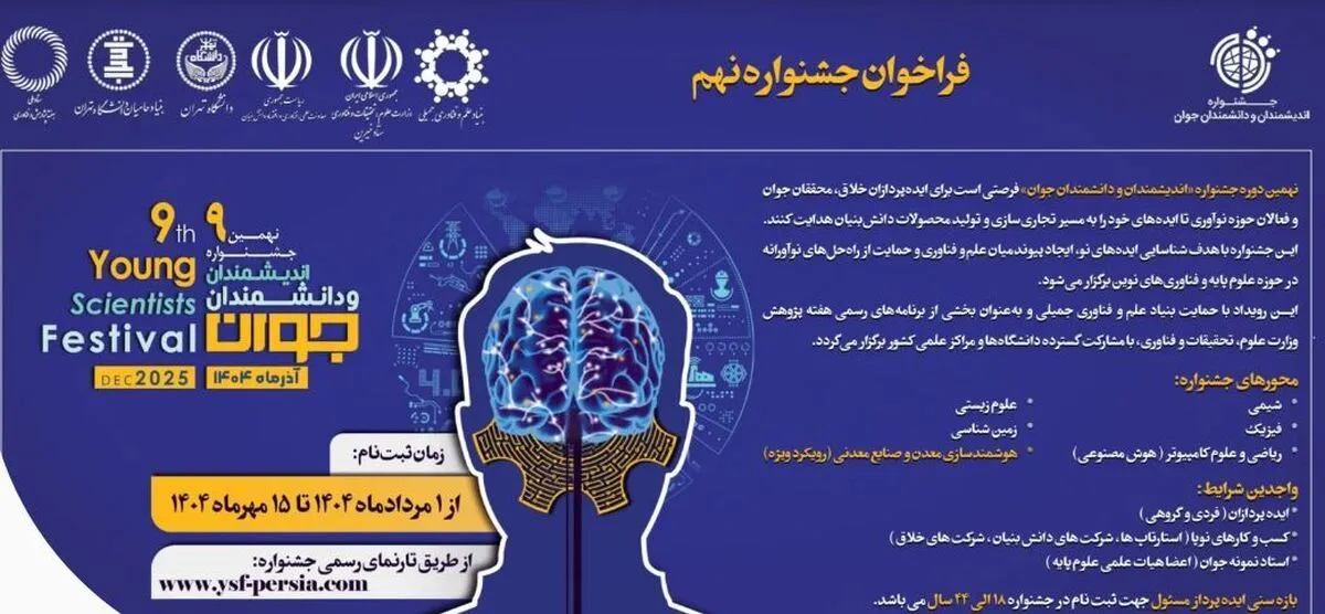 ثبت نام نهمین دوره جشنواره اندیشمندان و دانشمندان جوان از اول مردادماه ۱۴۰۴ آغاز و تا ۱۵ مهر ۱۴۰۴ ادامه دارد و زمان برگزاری اختتامیه جشنواره، آذر ماه ۱۴۰۴ خواهد بود.