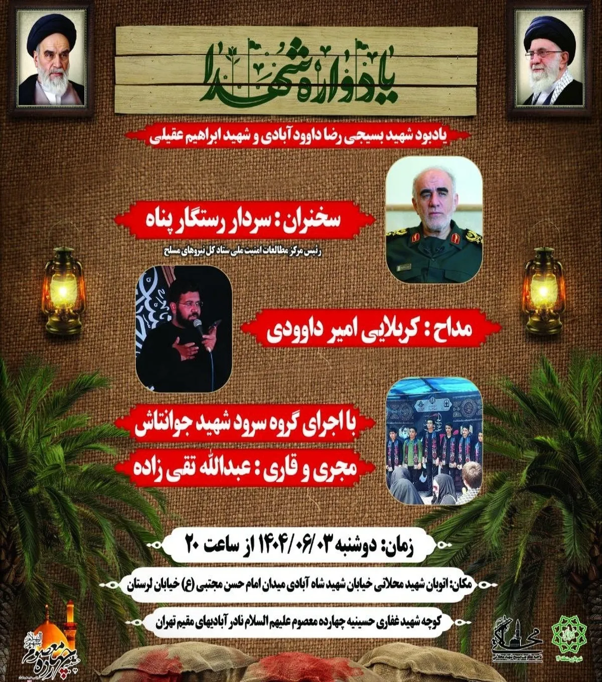 به گزارش خبرگزاری آنا، یادواره شهدای اقتدار (جنگ تحمیلی ۱۲ روزه) و اربعین شهید بسیجی رضا داوود آبادی و یادبود شهید ابراهیم عقیلی در روز سوم شهریور در حسینیه چهارده معصوم علیهم السلام برگزار میشود.