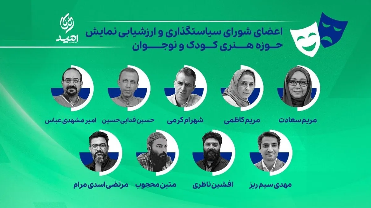 بر اساس این احکام، مریم سعادت (بازیگر و کارگردان پیشکسوت تئاتر و سینما)، مریم کاظمی (بازیگر، نویسنده، کارگردان و مدرس تئاتر و دبیر دو دوره جشنواره بین المللی کودک همدان)، شهرام کرمی (نویسنده و کارگردان و دبیر پنج دوره جشنواره بینالمللی کودک و نوجوان)، سید حسین فدایحسین (نویسنده، مترجم، کارگردان و مدرس تئاتر)، امیر مشهدیعباس (نویسنده و کارگردان، دبیر سه دوره جشنواره بینالمللی کودک و نوجوان و مدیرتالار هنر)، مهدی سیمریز (نمایشنامهنویس، پژوهشگر تئاتر و دبیر ادوار جشنواره تئاتر کودک رضوی)، افشین ناظری (کارگردان و نویسنده تئاتر، معاون مرکز تئاتر حوزه هنری)، متین محجوب مدیر مرکز تولیدات حوزه هنری کودک و نوجوان و مرتضی اسدی مرام راهبرتئاتر مرکز تولیدات به عنوان اعضای شورای سیاستگذاری و ارزشیابی تئاتر کودک و نوجوان معرفی شدند.