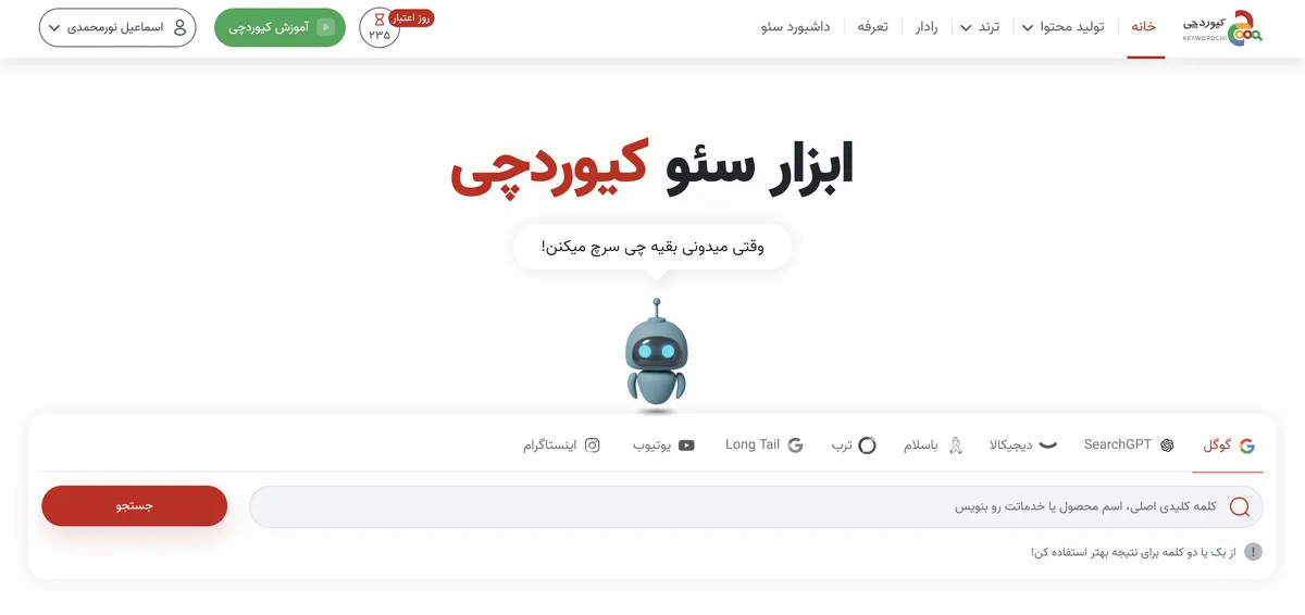 ابزار کیوردچی یک پلتفرم فارسیزبان است که هدفش کمک به تولید محتوای سئو شده با اتکا به هوش مصنوعی است. این سرویس با تحلیل رفتار جستوجو در پلتفرمهای مختلف نشان میدهد کاربران چه عباراتی را تایپ میکنند و چطور میتوان بر اساس آنها محتوای هدفمند نوشت. طراحی شده تا فرایند تحقیق کلمه کلیدی، نگارش، و بهینهسازی را کوتاه کند و تیمهای محتوا را در حرکت به سمت نتایج بهتر هدایت نماید.