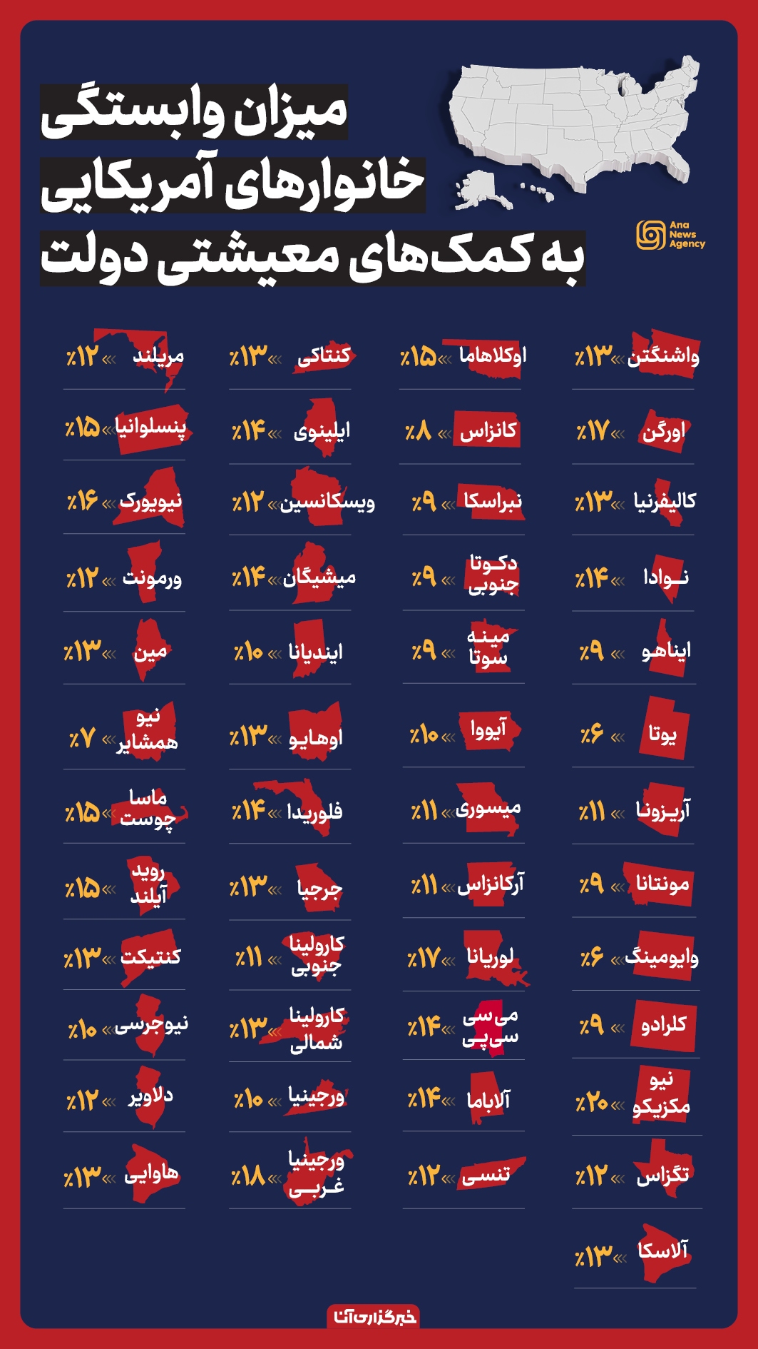 با وجود اقتصاد پیشرفته آمریکا، در ایالتهای مختلف این کشور، بخشی از مردم به کمکهای معیشتی و غذایی دولت وابسته هستند. یوتا کمترین (۶ درصد جمعیت) و نیومکزیکو بیشترین (۲۰ درصد جمعیت) وابستگی به کمکهای معیشتی دولتی را دارند.