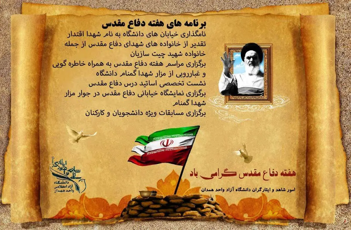 رئیس ستاد شاهد و ایثارگران دانشگاه آزاد اسلامی استان همدان افزود: همچنین نشست تخصصی استانی اساتید درس دفاع مقدس با مشارکت بنیاد حفظ آثار و نشر ارزشهای اسلامی و برپایی نمایشگاه خیابانی دفاع مقدس در جوار مزار شهدای گمنام دانشگاه از دیگر برنامههای شاخص این هفته خواهد بود.